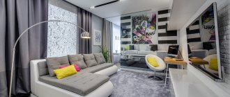 Asymmetry can manifest itself not only in parameters, but also in color scheme. Thus, curtains are made from fabrics of different colors, or colors are combined within each curtain. Typically, this stylistic solution is used for bright and functional interiors.