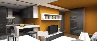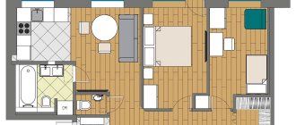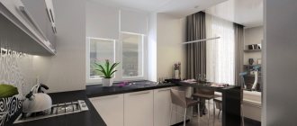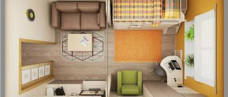 The desktop is equipped with wheels, which allows you to move it to the center of the living room when guests arrive. The spacious closet is represented by a corner model. And the most pleasant thing is that it was possible to fit a full-fledged rectangular bathtub in the bathroom due to the fact that narrow plumbing fixtures and a wall-hung toilet of the smallest size were used, and the washing machine was suspended above the toilet; - Example No. 3. The area of this apartment is 29 square meters. In this case, every centimeter of space was used to the maximum. Some of the partitions were dismantled, a niche was equipped to accommodate a bed, and the entrance to the kitchen was moved. Where there used to be a door to the kitchen is now a small workspace. In the kitchen of 5 sq.m. There is a large amount of built-in equipment. It was possible to fit it in thanks to the fact that the narrowest built-in models were chosen, and the gas stove was replaced with a two-burner hob. In order to have a full-fledged work area, the tabletop was extended and opposite the window. The bedroom and living room essentially form one room. But the sleeping area is isolated due to the retractable screen. The diagram shows that a large corner wardrobe fits in the hallway. Additional storage space is provided by a niche in the sofa and a large box under the mattress of the bed with a lifting mechanism, as well as wall shelves;