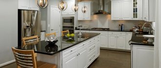 If you don’t want to tear the top row, you can use it to go around the ledge, partially hiding it. In principle, there is nothing complicated here. It’s just that one of the upper cabinets will have to be given a non-standard shape and/or size in accordance with the configuration of the box. To make the protrusion even less noticeable, you need to finish it to match the walls and apron.
