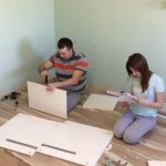 The highlight of the program was the common base of boards for the entire wall. You can see it in one of the photos below. This is an ordinary wooden frame designed to raise a furniture wall above the floor. The idea turned out to be successful for several reasons
