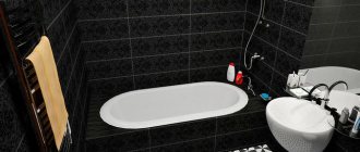 The design of a long bathroom with a small width involves installing plumbing along the wall. However, you can, sacrificing the ability to take a bath while lying down, install a compact seated model along a narrow wall.