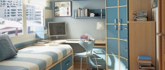 A set of furniture for a small bedroom should consist of a minimum number of items. The presence of decor and accessories in it is allowed only if necessary. An excellent option for such a room would be transformable headsets. During the day there is a bookcase, in the evening there is a bed.