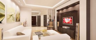 By installing panels from other materials, you can effectively divide the room into functional zones. This technique is especially relevant for small living rooms in “Khrushchev” buildings, in which often after redevelopment the hall turns out to be combined with a kitchen. You can also separate the two areas with a bar counter, in which it is customary to install glass storage units and additional lighting.