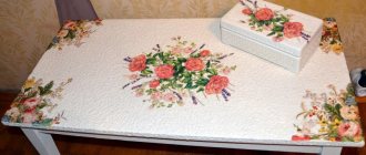 The prepared surface of the table is covered with PVA glue and the necessary elements are laid out. Using a rubber roller or plastic spatula, smooth the surface, removing bubbles. After the glue has dried, coat it with several layers of varnish.