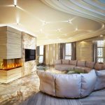 В минималистичном интерьере гостиной или спальни, где мало мебели, роскошно смотрится бархатная мягкая мебель на подиуме или в виде островка в центре комнаты. Гостеприимную атмосферу обеспечит свисающая с потолка люстра с кристаллическими шариками над журнальным столиком – между диванами и креслами.