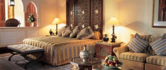 Мебель всегда в центре внимания гостей. В этом направлении она выполняет не только свою прямую функцию и предназначение – это главный атрибут для восторженных взглядов. Мягкие диваны и кресла должны быть с дорогой, бархатной или шелковой обивкой, на которой изображен традиционный цветочный рисунок с позолотой. Спинки диванов отличаются немного вытянутой формой, как и ножки. В качестве декора выступают бахрома, кисти. Обязательно много подушек разной формы и тканей. основа для мебельного каркаса – натуральное дерево или качественная его имитация. Более бюджетный вариант – прочное ДСП.