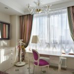Рабочее место может быть организовано и менее обычным способом. Например, одна из закрытых секций горки может включать нишу с откидной столешницей и полками.