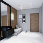 Отделить спальное место от гостиной можно с помощью небольшой перегородки, а от входной зоны – встроенным шкафом