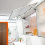 Такие осветительные приборы пользуются большим спросом, что обусловлено разнообразностью типов — они отличаются дизайном и функциональностью. Установите на козырек модульного шкафа точечный галогенный светильник и направьте его лучи вниз — итог будет поразительным.
