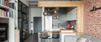 Так как в квартире все равно придется выделять место для плиты и других кухонных принадлежностей, стоит разделить место для приема пищи и жилую зону барной стойкой. От большого обеденного стола стоит отказаться, так как он займет слишком много места.