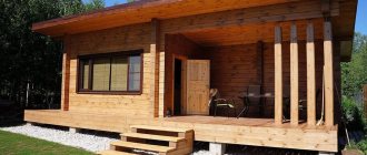 - На входе в помещение бани под навесом имеется площадка с покрытием. Для маленькой бани нет смысла строить полноценную террасу, а вот навес над входом поможет организовать летние посиделки вечерком, после парилки.