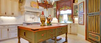 Как правило, верхние полочки такого шкафа застелены или вообще остаются открытыми – таким образом, посуда может выполнять декоративную роль, но в то же время защищена от пыли, влаги и жира.