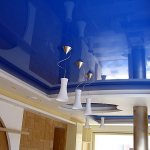 Зеркальная поверхность полимерной мембраны, освещаемая светильниками рамы из гипсокартона, идеально отражает свет, благодаря чему высота потолков визуально увеличивается почти вдвое.