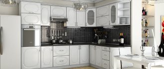 Пользуются популярностью и угловые гарнитуры. Чаще всего, их устанавливают в маленьких квадратных кухнях, а фасады подбирают светлые.