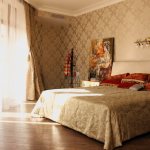 Приветствуется сочетание материалов с крупными и мелкими принтами. Для меблировки комнаты подбирают темные или светлые изделия из дуба, сосны, красного дерева.
