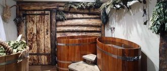 При этом внутри дома можно установить небольшой бассейн или купель, а снаружи (для зимних забав) — поставить чан или бочку для погружения, недалеко от выхода из дома.