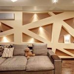 - Гипсокартон. Применяется еще реже, чем обои. Необходим для создания каркасов сложных рельефов на потолке, полу и стенах.